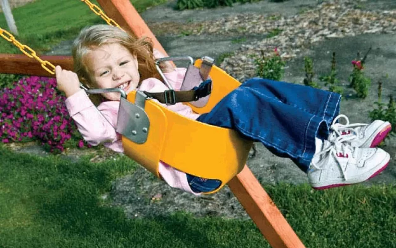 Такие качели – с широкой поддерживающей спинкой, надёжными креплениями и регулируемым ремнем безопасности – идеальны как для малышей, так и для детей постарше.