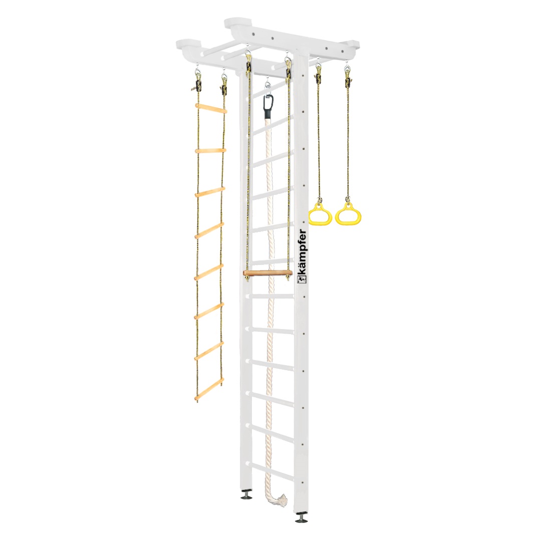 Комплектация: шведская стенка, канат, кольца, верёвочная лестница, трапеция