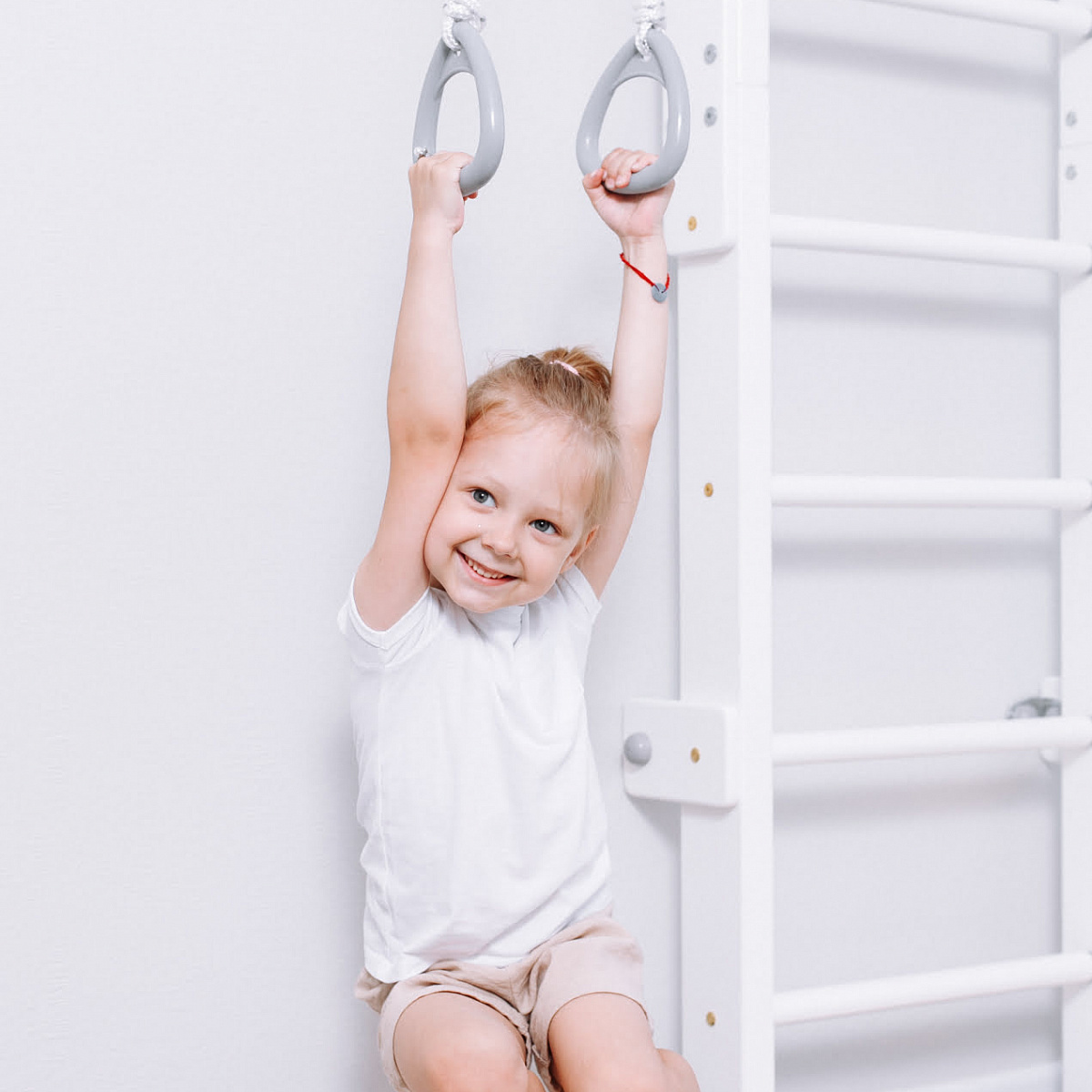 Каркас и ступени спортивного комплекса изготовлены из хвойной древесины, что высоко ценится любителями натуральных материалов в интерьере. Покрытие комплекса выполнено краской белого цвета, экологически безопасной для детей.