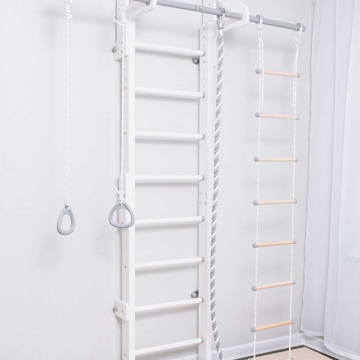 Спортивный комплекс ROMANA Eco2 может быть установлен как к стене, так и враспор - в зависимости от того, как удобно пользователю. По необходимости стенку легко переставить в другое место. В комплексе предусмотрен широкий фиксированный турник, на котором размещается навесное оборудование: кольца, веревочная лестница и канат.