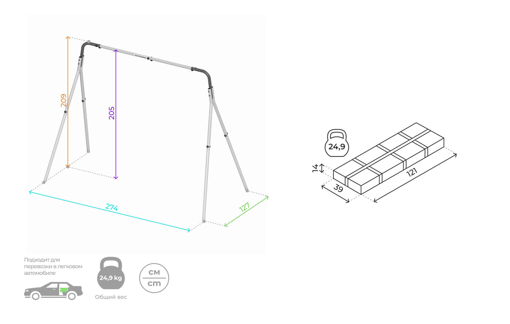 Высота качельной балки, см 205